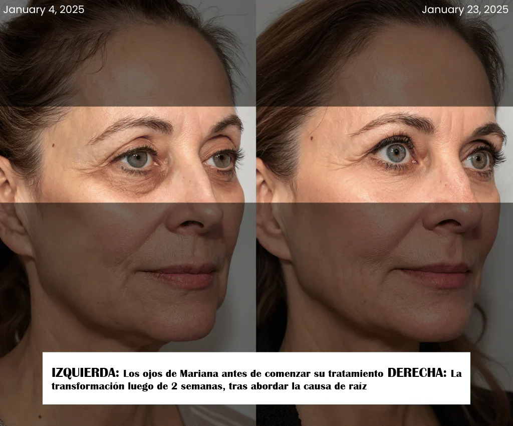 La fatiga suprarrenal crónica daña la delicada piel bajo los ojos, creando bolsas y ojeras persistentes que el corrector simplemente no puede ocultar.